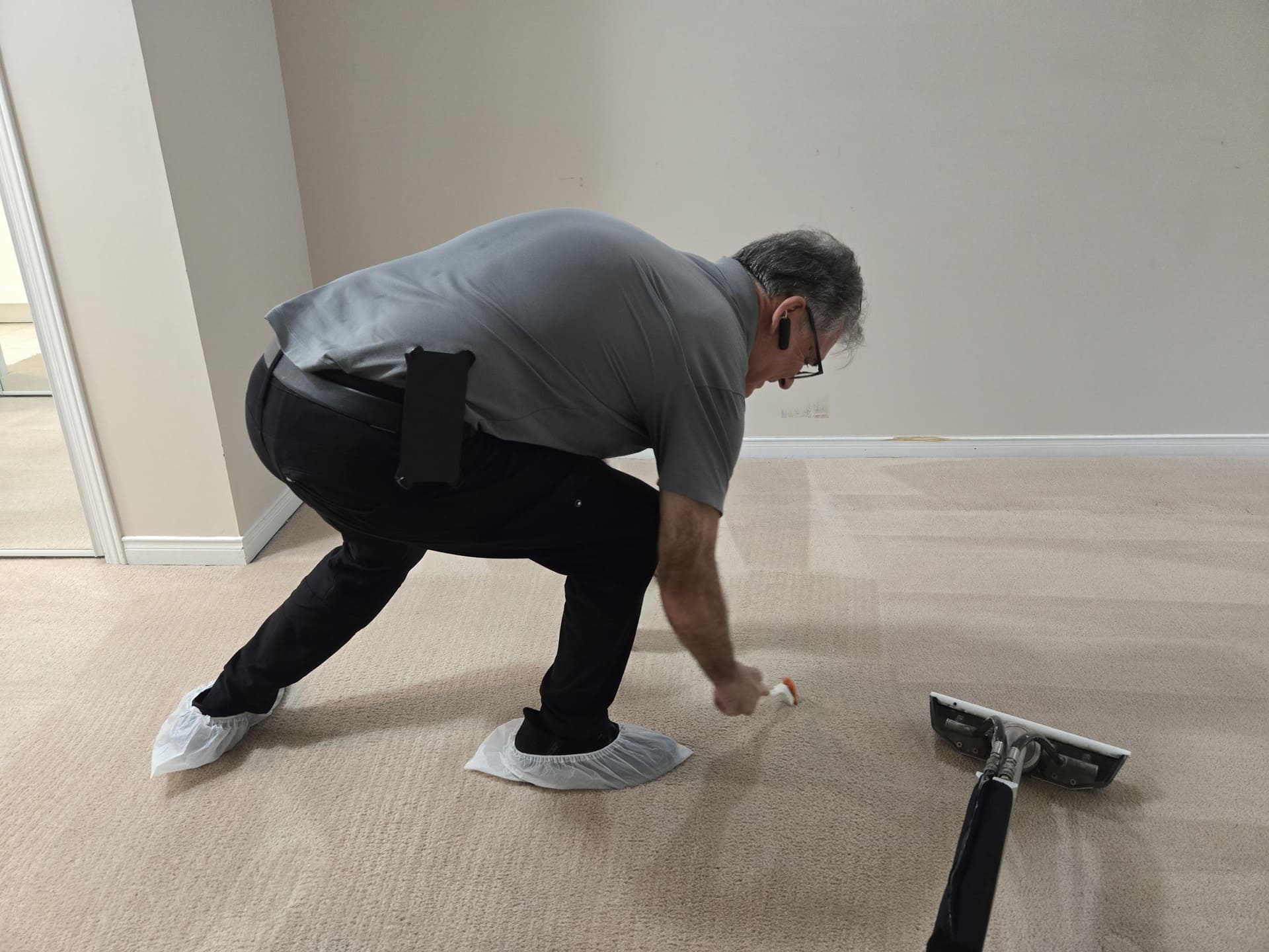 When I arrived for the initial walkthrough, I could see what Marian meant. The carpets weren’t heavily damaged, but the texture felt flat, and there were visible discolored patches near the hallway and living room. Using a black light, we were able to spot a few hidden areas affected by pet accidents — something most homeowners can’t see with the naked eye.